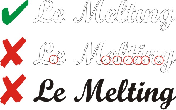 - Dans le cas des lettres type "manuscrites" ou logos, il faut que les lettres soient soudées. Il ne doit pas y avoir de traits de séparation entre chaque lettre, comme sur le schéma ci-dessous :