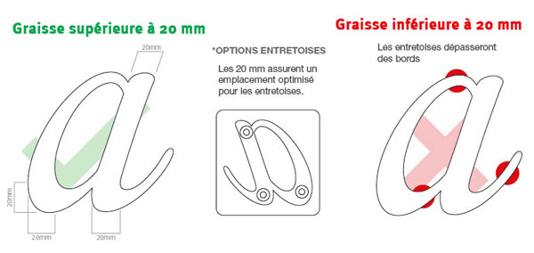 - Graisse 20 mm : obligatoire si vos lettres ont des entretoises (supports internes pour les lettres comme A, B, D, O, P, R)