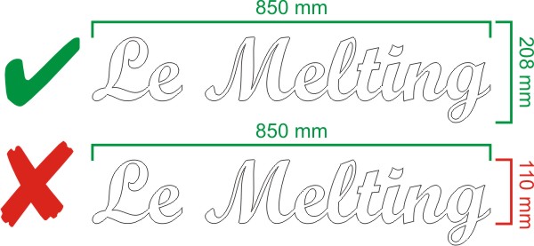 Prenons l'exemple des lettres découpées en bois. Par exemple, nous souhaitons découper les lettres "Le Melting". Comme sur le schéma ci-dessous, nous allons calculer la hauteur des lettres en prenant le haut et le bas des lettres. Pour la largeur, nous allons calculer avec les espaces, et du L de Le au g de Melting.