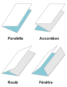Nous pouvons imprimer un 2 volets. Le format fermé sera alors de 148x210 mm. Mais nous pouvons également choisir d'imprimer un 3 volets. Et dans ce cas, Papeo vous propose plusieurs plis : plis roulés, plis accordéon, plis roulés, ou plis fenêtre