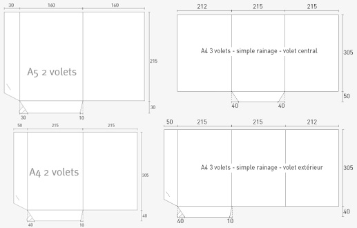 Le plus simple est de télécharger le fichier d'aide à l'utilisation des gabarits ci-dessus. C'est un fichier PDF que vous pouvez importer dans Photoshop, Illustrator, InDesign ou tout autre logiciel de mise en page.